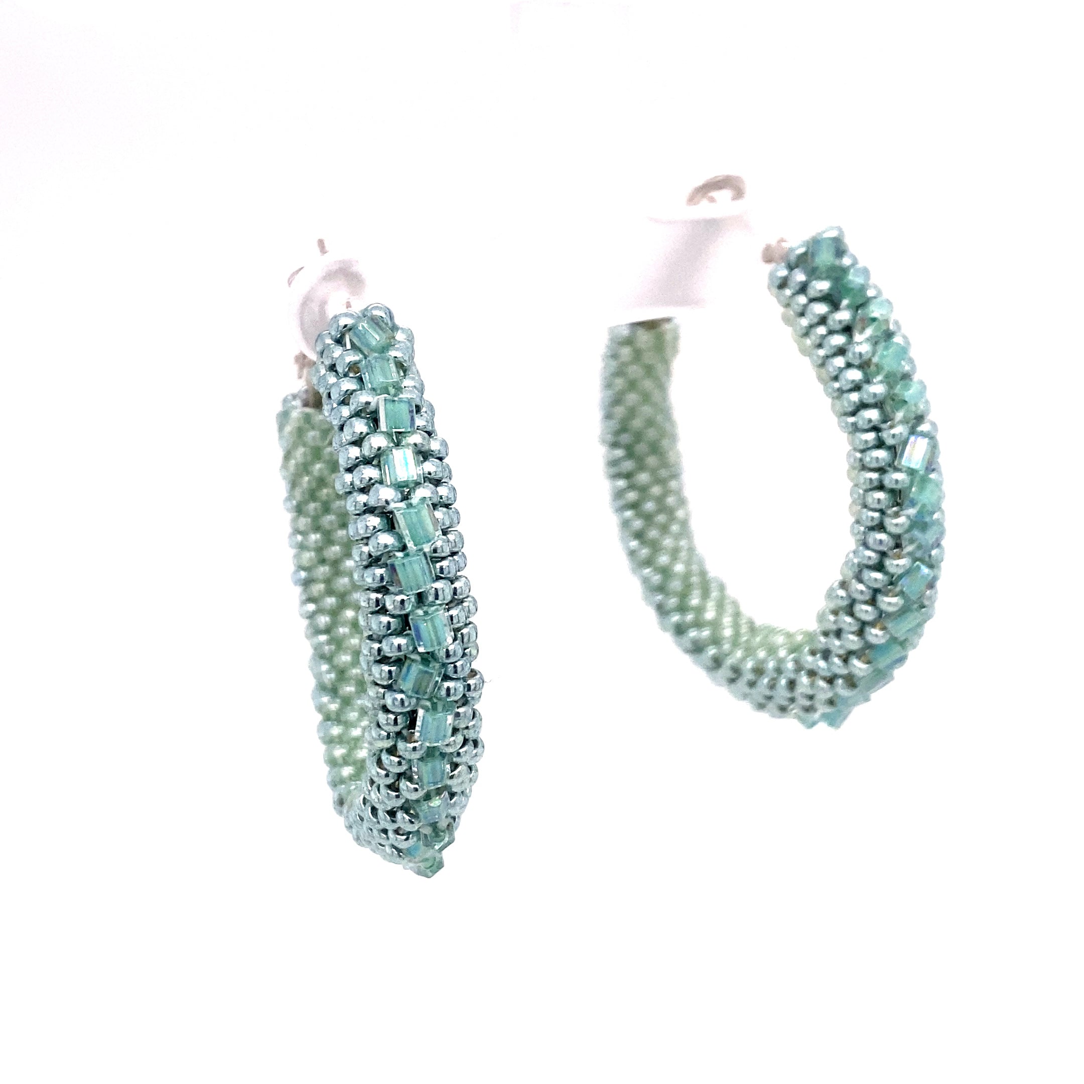 Aquamarine Beaded Silver Hoop Earrings Medium