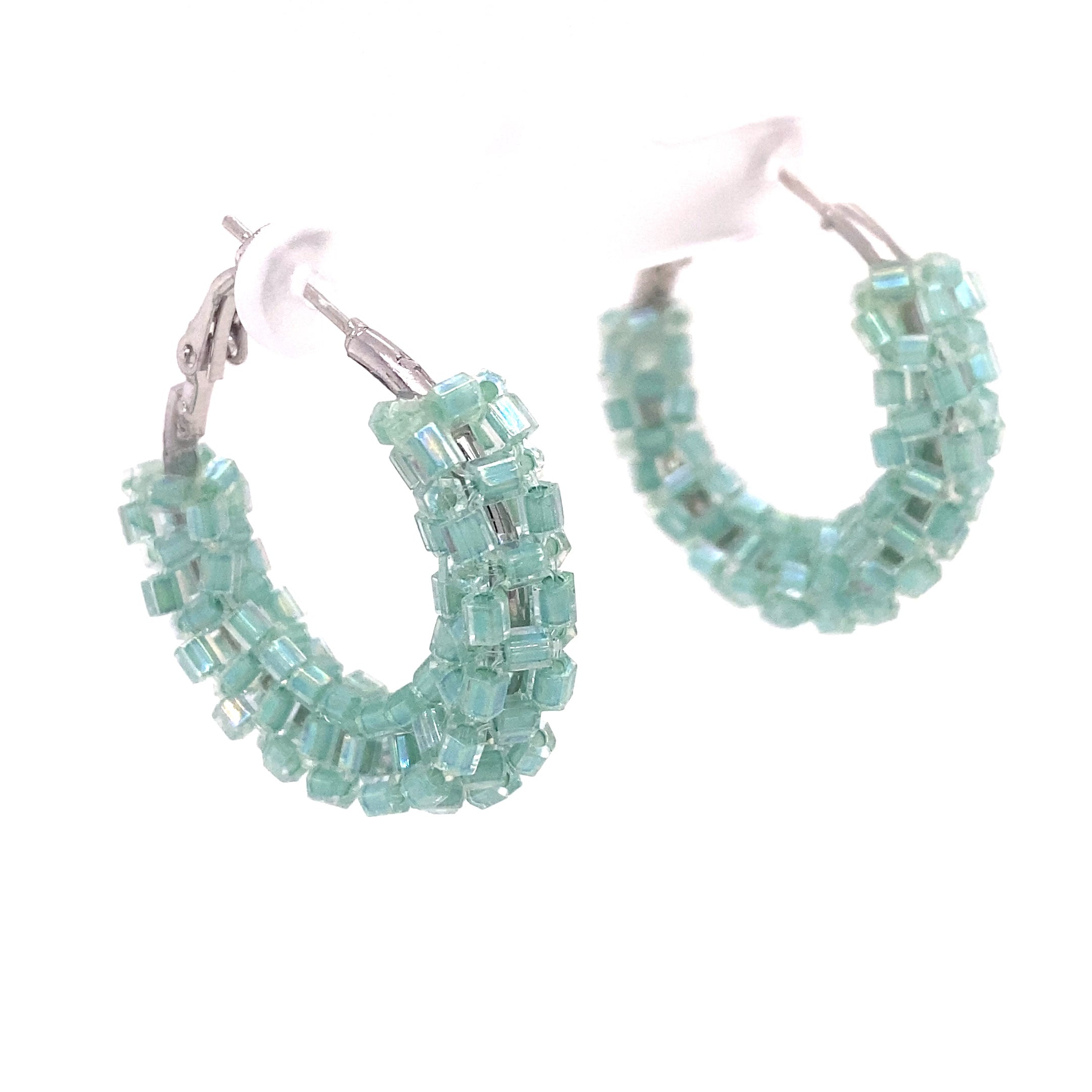 Uniquely handmade with aquamarine beads, these hoops are stunning, super-lightweight, and comfortable. Meticulous wrapping techniques are repeated to secure these captivating aquamarine beads to the silver plated stainless steel hoops. Spice up your next holiday or vacation with these beauties. These dazzling earrings will be just the right touch to add to your outfit and let them know YOU have AMAEZING taste!