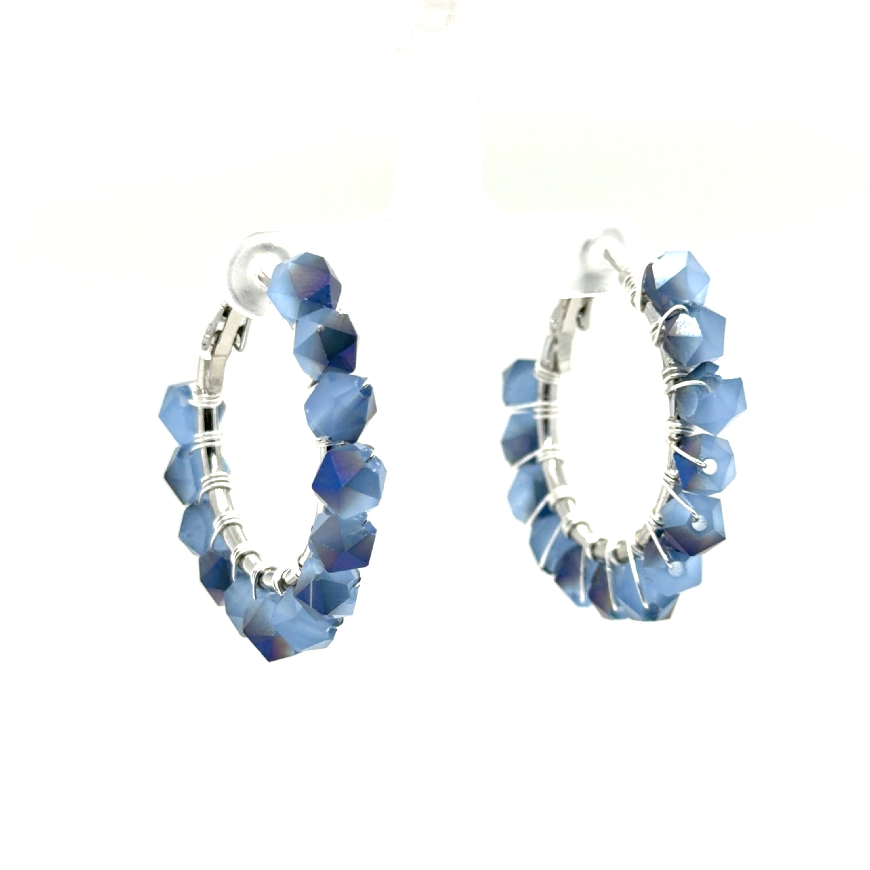 Elevate your everyday style with these stunning handcrafted hoop earrings, featuring blue quartz gemstone beads meticulously wire-wrapped onto sleek stainless steel hoops. The beads capture varying shades of serene blue — from soft sky tones to deeper oceanic hues — creating a unique and eye-catching look. The intricate silver wire wrapping secures every stone while adding a delicate, artisanal touch. Lightweight and comfortable for all-day wear, these earrings swing gently with movement, making them perfect statement pieces for casual outings or layered ensembles.
