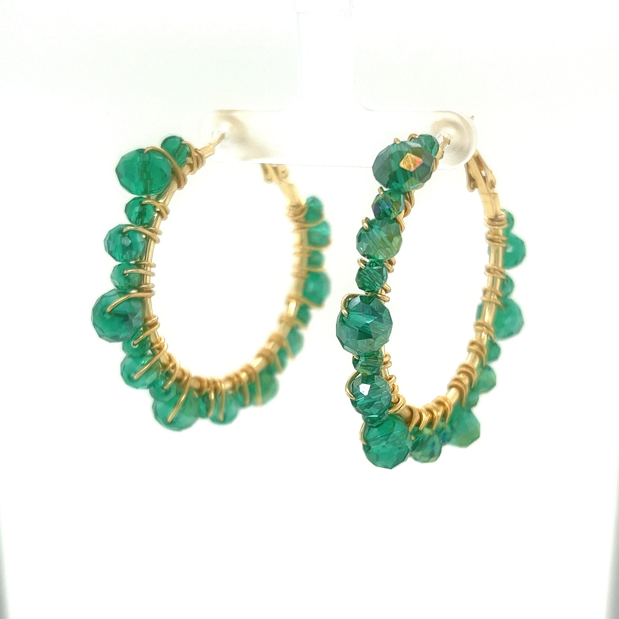 Beautiful green beads make these hoops stand out! Our gold plated stainless steel hoop earrings are created with an intricate wrapping technique that secures the beads to the hoops. They are an excellent fashion accessory to spice up any occasion. These sophisticated and bold statement earrings also make the perfect gift to that special person with AMAEZING TASTE!