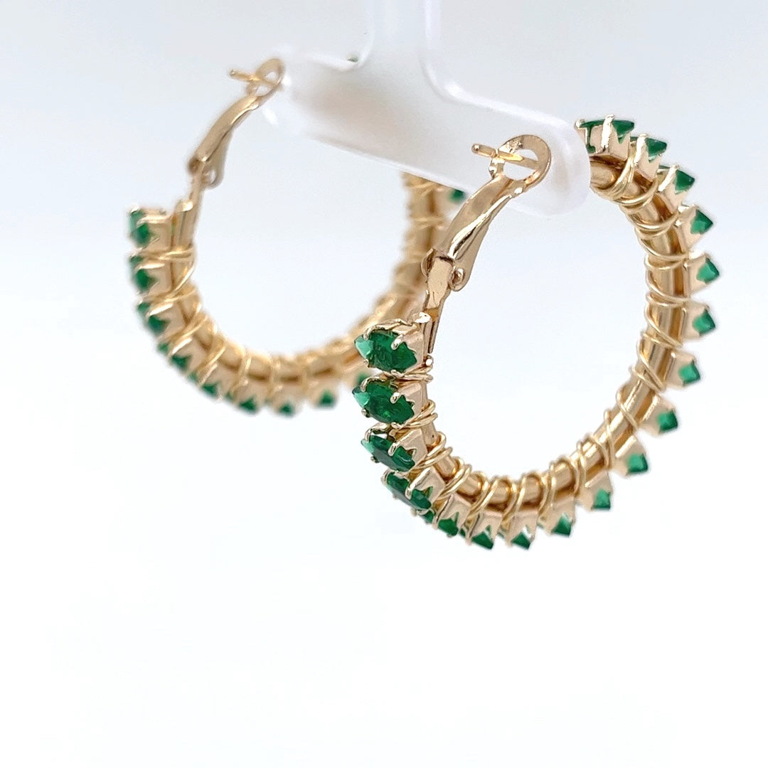 Uniquely handmade with green rhinestones, these hoops are stunning, super-lightweight, and comfortable. Meticulous wrapping techniques are repeated to secure these captivating green rhinestones to the gold plated stainless steel hoops. Spice up your next holiday or vacation with these beauties. These earrings add pizzazz to just about any occasion – treat yourself to these beauties and show the world you have AMAEZING taste!