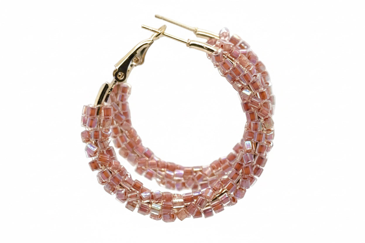 Let these Maeven in Me Signature Beaded Hoop Earrings bring a soft, shimmering glow to your collection. Handcrafted with love in Rhode Island, each pair is wrapped in multiple rows of premium seed beads in a delicate blush-pink hue, accented by faceted crystals with stunning AB (Aurora Borealis) iridescent finishes that shift and sparkle in every light—think subtle rainbow flashes and a dreamy, ethereal shine.