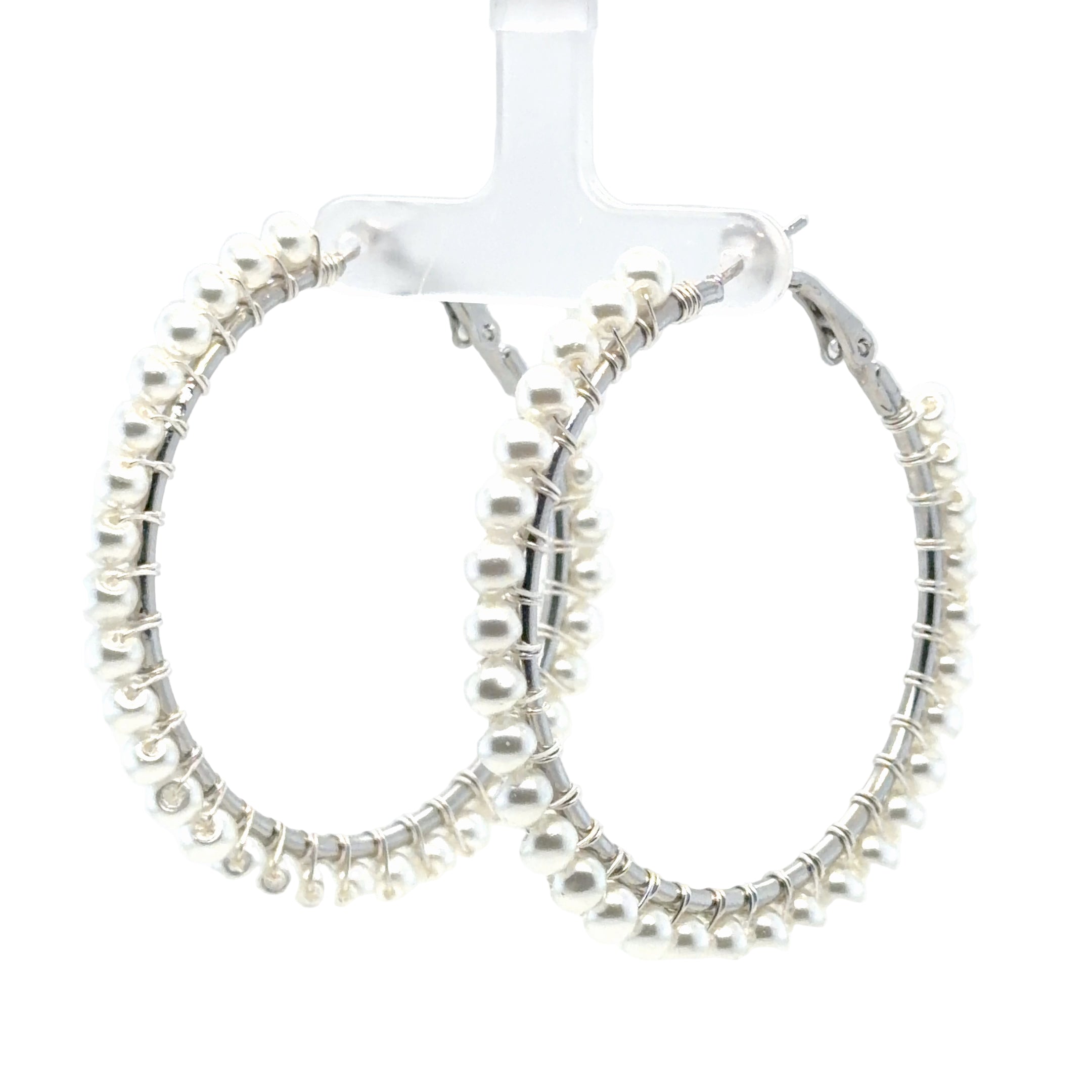 Enhance your jewelry collection with these exquisitely crafted white pearls on a silver plated hoop earrings. The beaded design offers a contemporary yet classic appeal, making them suitable for everyday elegance or special occasions. These earrings showcase a seamless blend of craftsmanship and minimalist style, perfect for the modern woman.