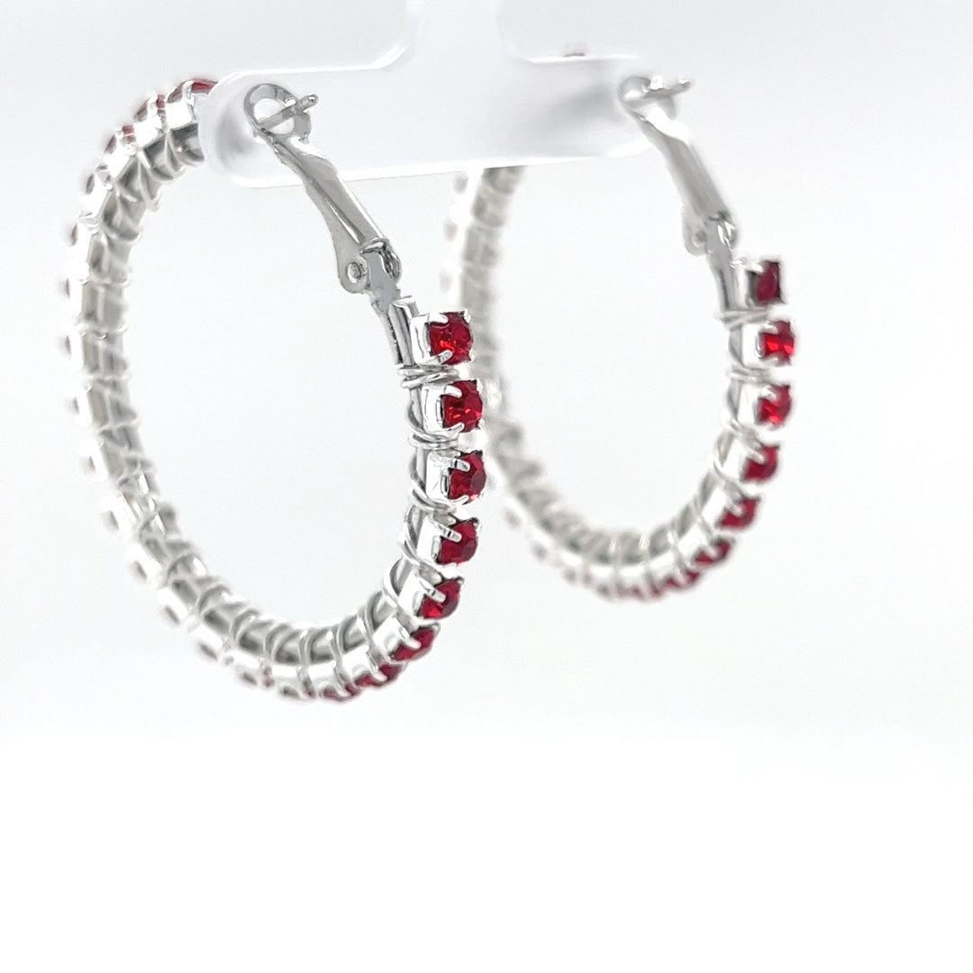 Red Rhinestone Silver Hoop Earrings Medium