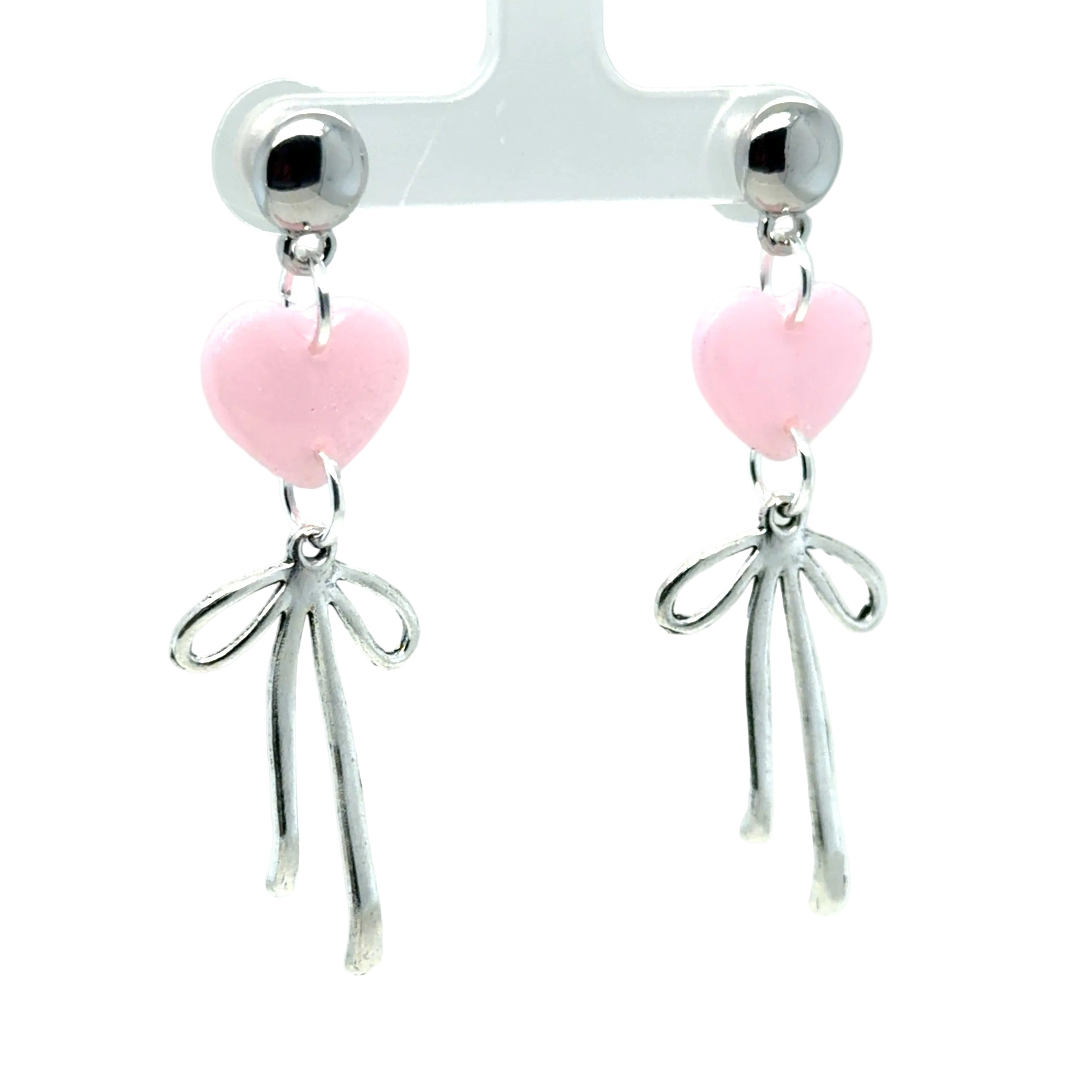 Embrace your playful side with our Silver Bow Dangle Earrings. Featuring delightful pastel pink heart charms that dangle gracefully, these earrings are accentuated by elegant silver bows, creating a charming combination that is both fun and stylish.