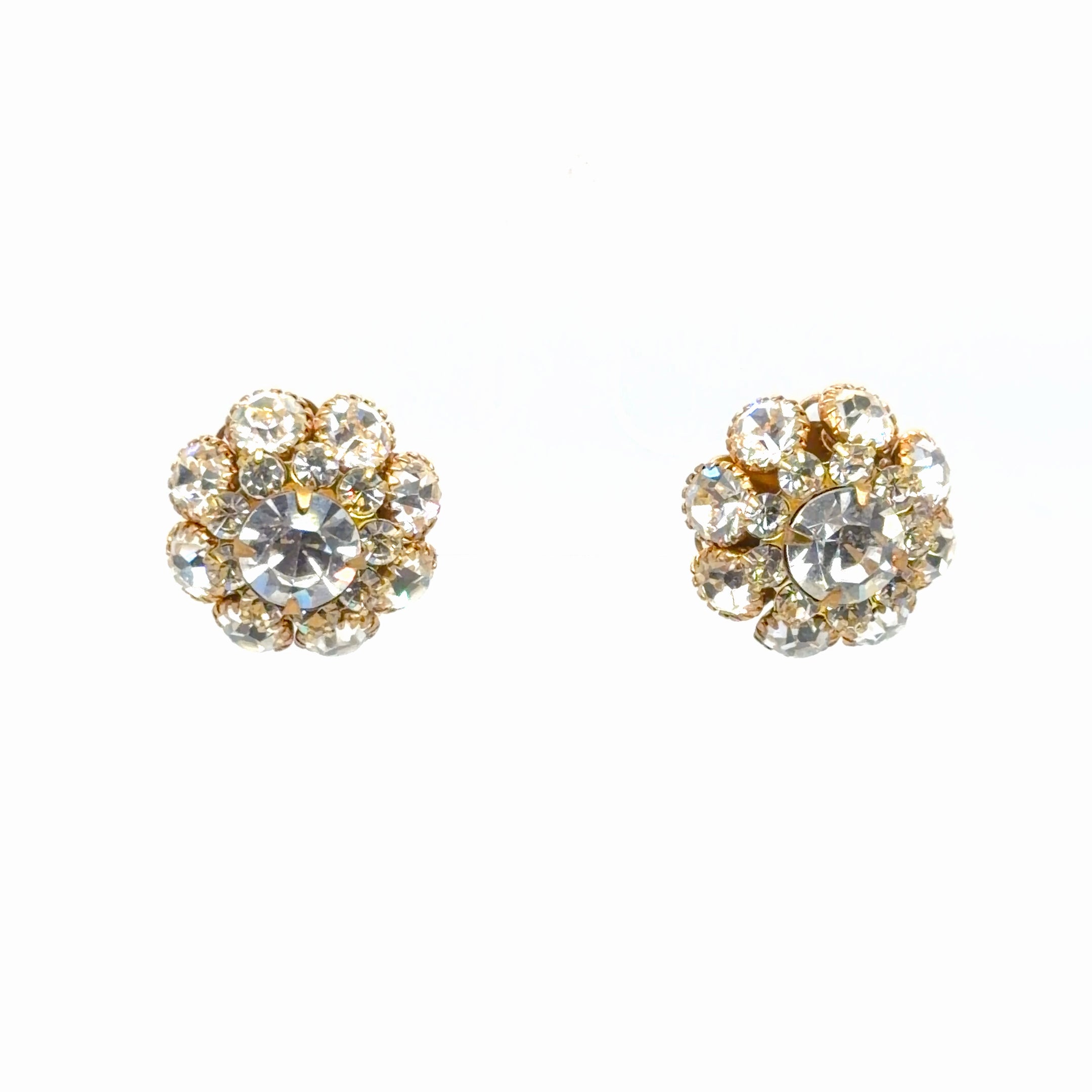 Elevate your ensemble with these radiant stud earrings, crafted in yellow gold. Each earring showcases a central, brilliant cut crystal, surrounded by a halo of smaller, equally dazzling crystals. These earrings are designed to capture and reflect light, creating a captivating sparkle. The secure setting ensures comfortable wear and lasting elegance. A perfect choice for adding a touch of sophistication to any look.